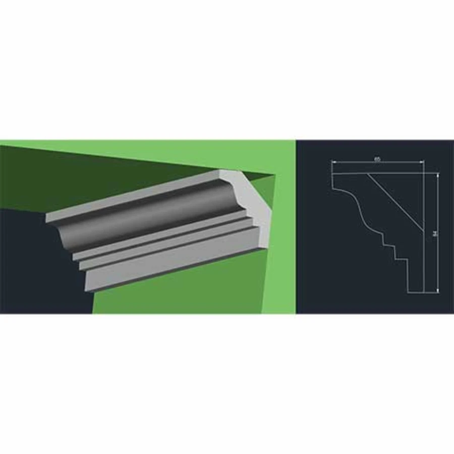 Cornisă de tavan CT 03 realizată din polistiren XPS, cu dimensiuni 65x84x2000 mm, destinată finisajelor interioare și mascării îmbinărilor dintre perete și tavan.