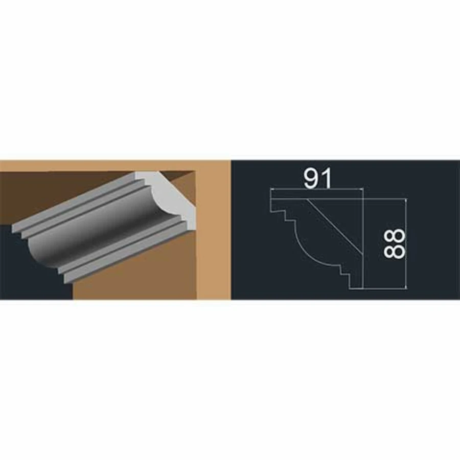 Cornisă tavan polistiren XPS CT 07, dimensiuni 91 × 88 × 2000 mm, utilizată pentru finisaje interioare și evidențierea liniei dintre perete și tavan.
