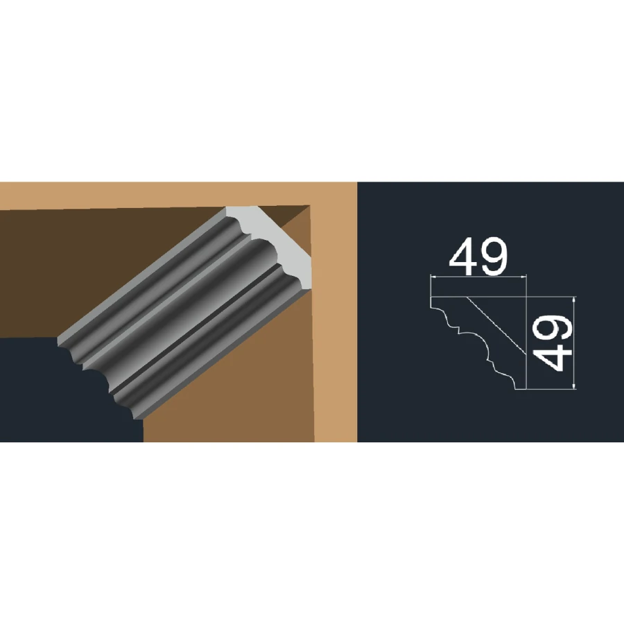 Cornisă de tavan CT 15 realizată din polistiren XPS, cu dimensiuni 49x49x2000 mm, destinată finisajelor decorative interioare și mascării îmbinărilor dintre perete și tavan.