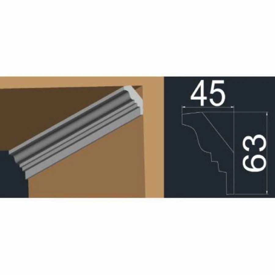 Prin utilizarea unei cornișe de tavan din polistiren XPS, se pot masca mici imperfecțiuni la îmbinarea peretelui cu tavanul, oferind în același timp un plus de coerență vizuală. Dimensiunea de 2000 mm permite o instalare eficientă, cu un număr redus de îmbinări, iar secțiunea de 45×63 mm asigură o prezență vizibilă, fără a încărca excesiv spațiul.