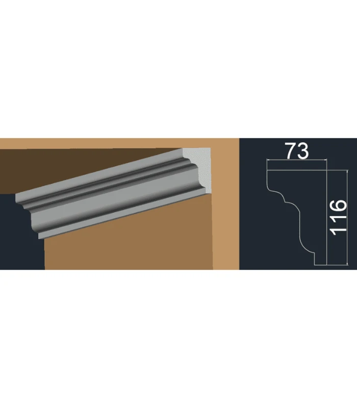Cu dimensiunile de 73 x 116 x 2000 mm, cornișa CIE 02 este concepută pentru a asigura un echilibru între funcționalitate și aspect estetic. Forma sa permite mascarea îmbinărilor dintre pereți și tavan, contribuind la un finisaj ordonat și coerent. Materialul din polistiren XPS este ușor, ceea ce facilitează manipularea și montajul, fără a încărca structura pe care este aplicată.