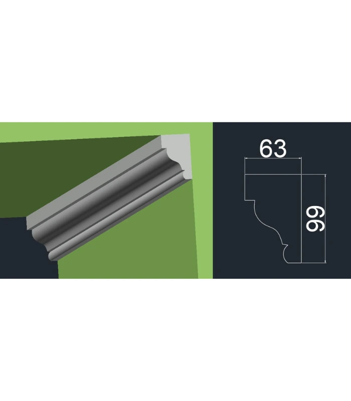 Cu dimensiunile de 99 × 63 × 2000 mm, cornișa permite o montare precisă și uniformă, fiind potrivită pentru conturarea elegantă a zonelor de trecere dintre suprafețe. Polistirenul XPS este un material frecvent utilizat în elementele decorative datorită greutății reduse și ușurinței în prelucrare, facilitând manipularea și instalarea.
