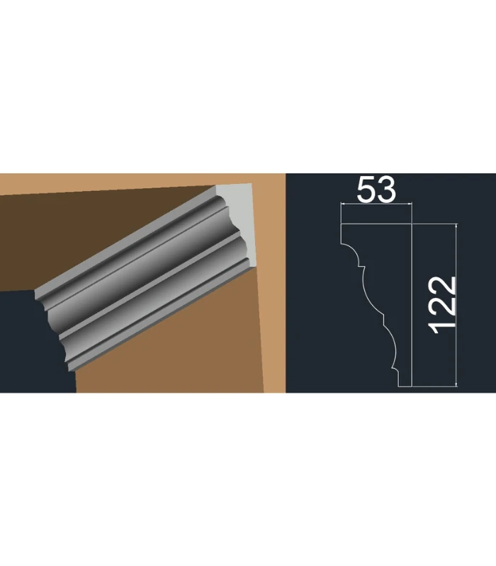 Dimensiunile de 122 × 53 × 2000 mm permit utilizarea cornisei în spații variate, de la încăperi de dimensiuni medii până la suprafețe extinse. Greutatea redusă facilitează manipularea și instalarea, iar suprafața este compatibilă cu vopsirea ulterioară, pentru adaptarea la paleta cromatică a proiectului.